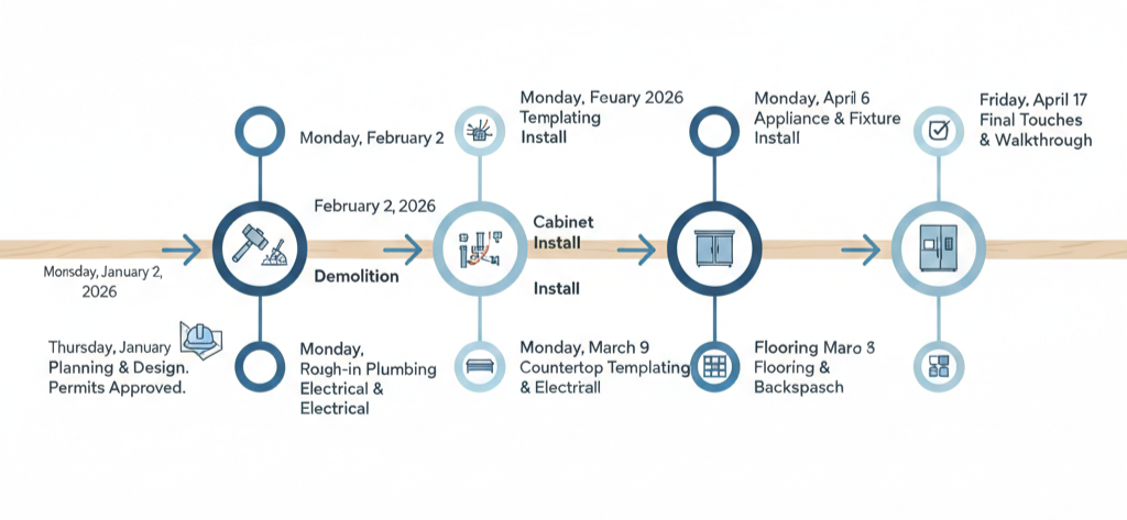 You see start and finish dates tied to the entire process, not optimistic guesses that ignore pre-construction realities. This is where most remodels quietly fall apart — contractors underestimate early phases and the whole schedule drifts.